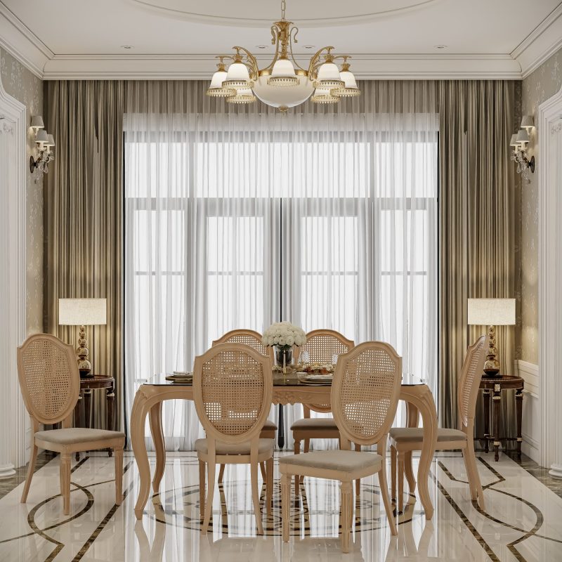 - فضاهای بزرگ: برای فضاهای بزرگ، میتوانید از میزهای مستطیلی یا بیضی بزرگ استفاده کنید. همچنین، میتوانید یک میز گرد بزرگ را در مرکز فضا قرار دهید تا فضایی مجلل و باشکوه ایجاد کنید.