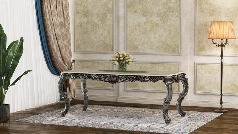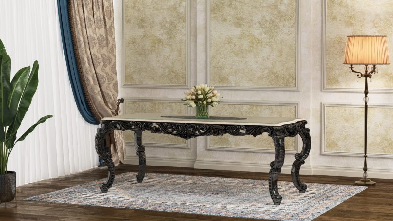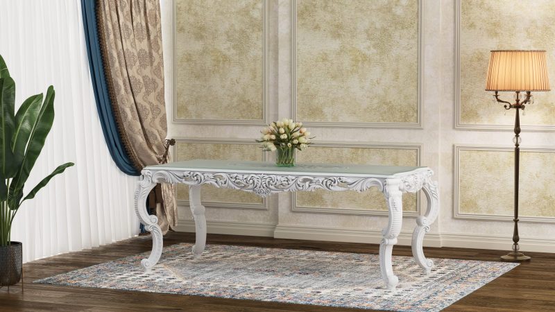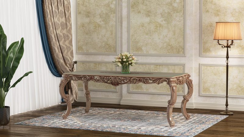 میز ناهارخوری روناک ترکیب طراحی کلاسیک و مدرن و الهام گرفته از نقوش هندسی و ایجاد سبک نئو کلاسیک با منبت کاری های برجسته گل های بهاری، مناسب برای انواع دکوراسیون و سالن های غذاخوری و تالارهای عروسی.