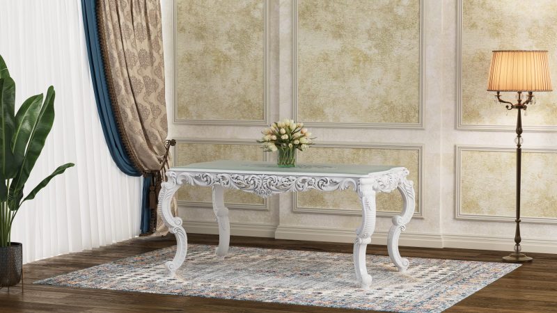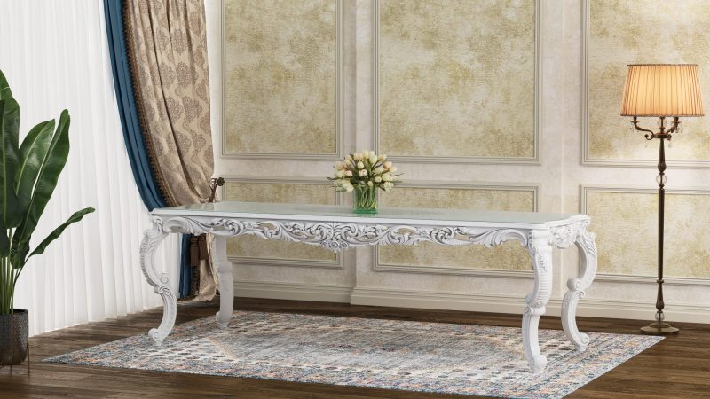 میز ناهارخوری روناک ترکیب طراحی کلاسیک و مدرن و الهام گرفته از نقوش هندسی و ایجاد سبک نئو کلاسیک و منبت کاری برجسته گل های بهاری، مناسب برای انواع دکوراسیون منازل، سالن های غذاخوری و تالارهای عروسی.